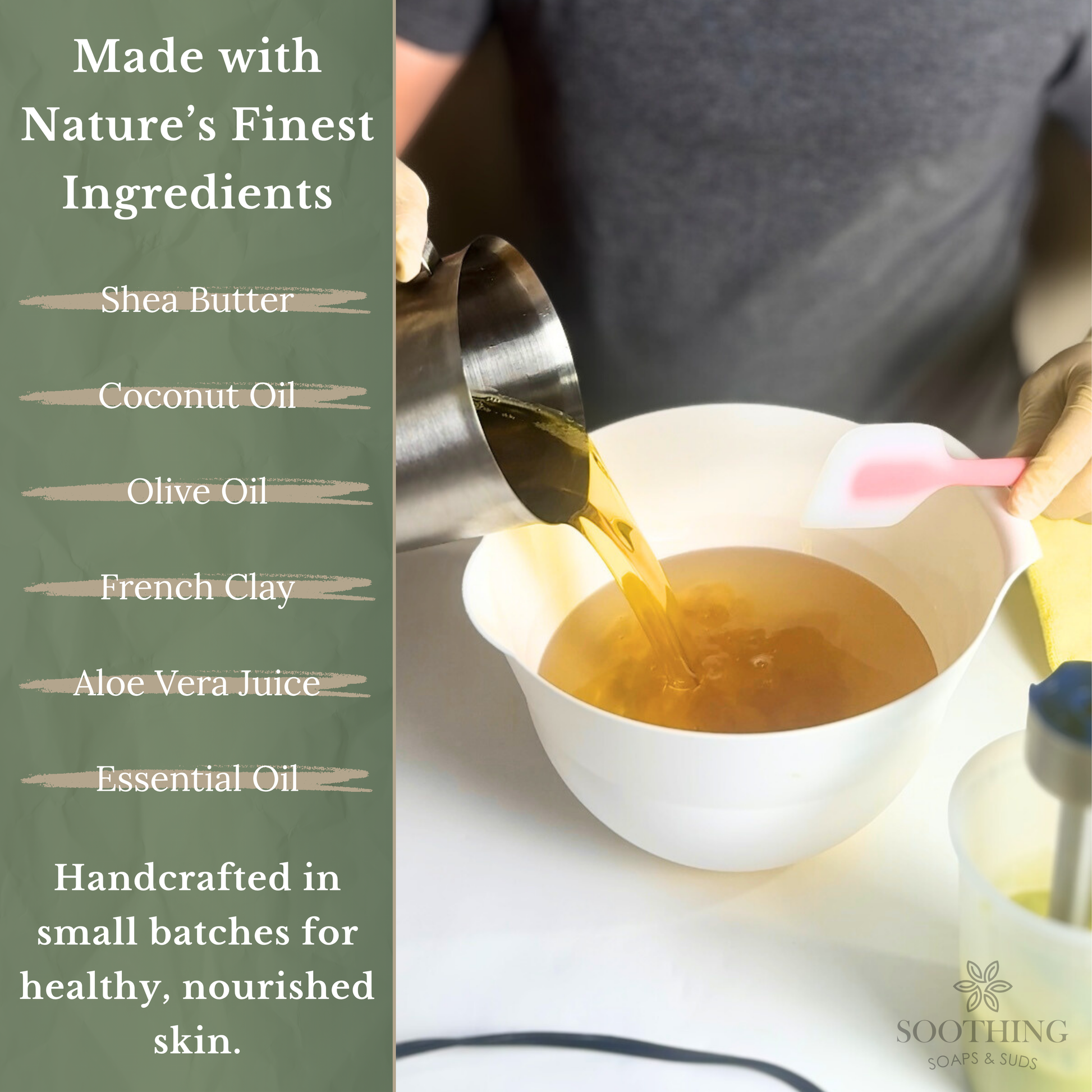 Saponified Oils of: (Olive · Coconut · Castor) · Shea Butter · Tallow · Aloe Juice · Cow Milk · Turmeric · Spirulina · French Clay · Lavender & Lemongrass Essential Oils