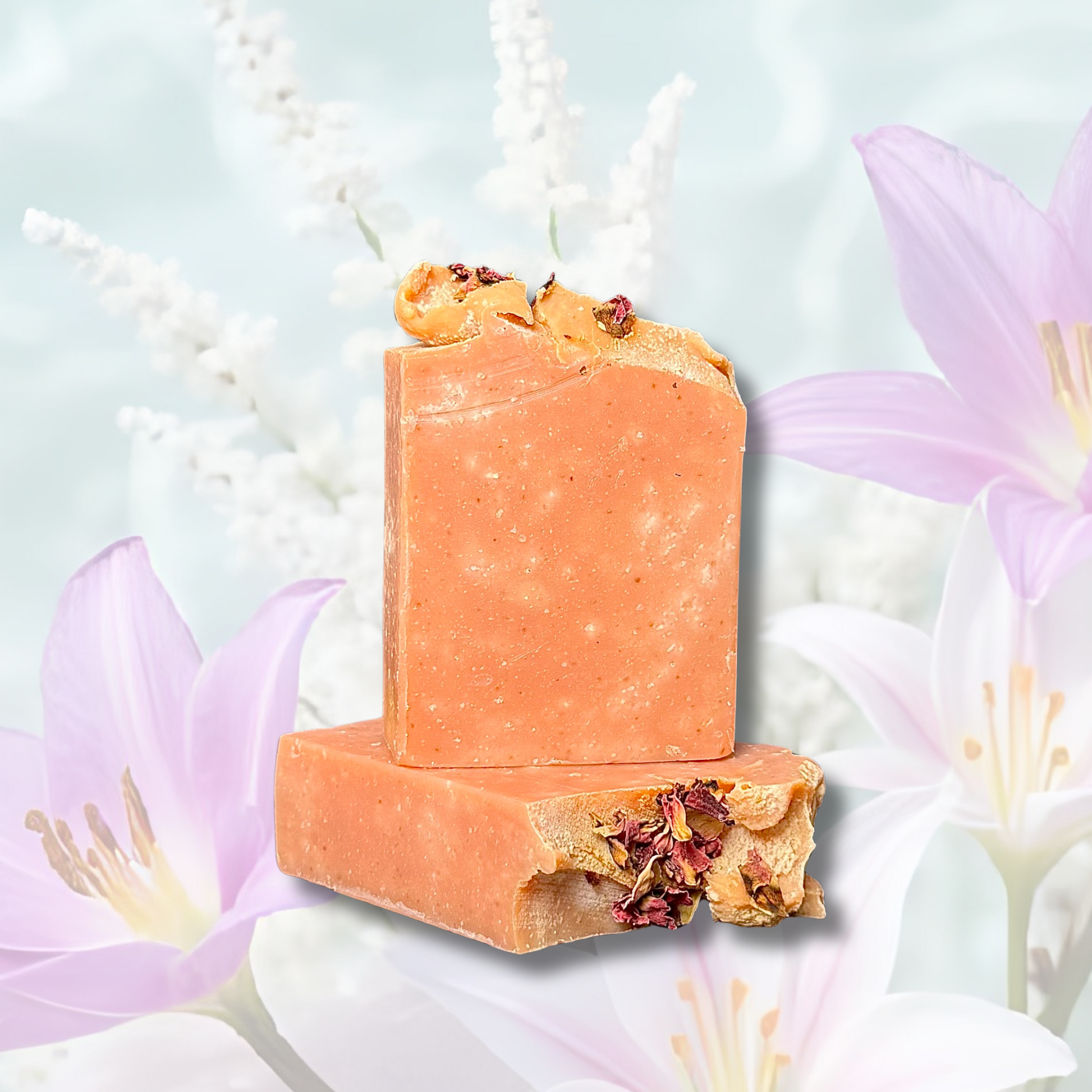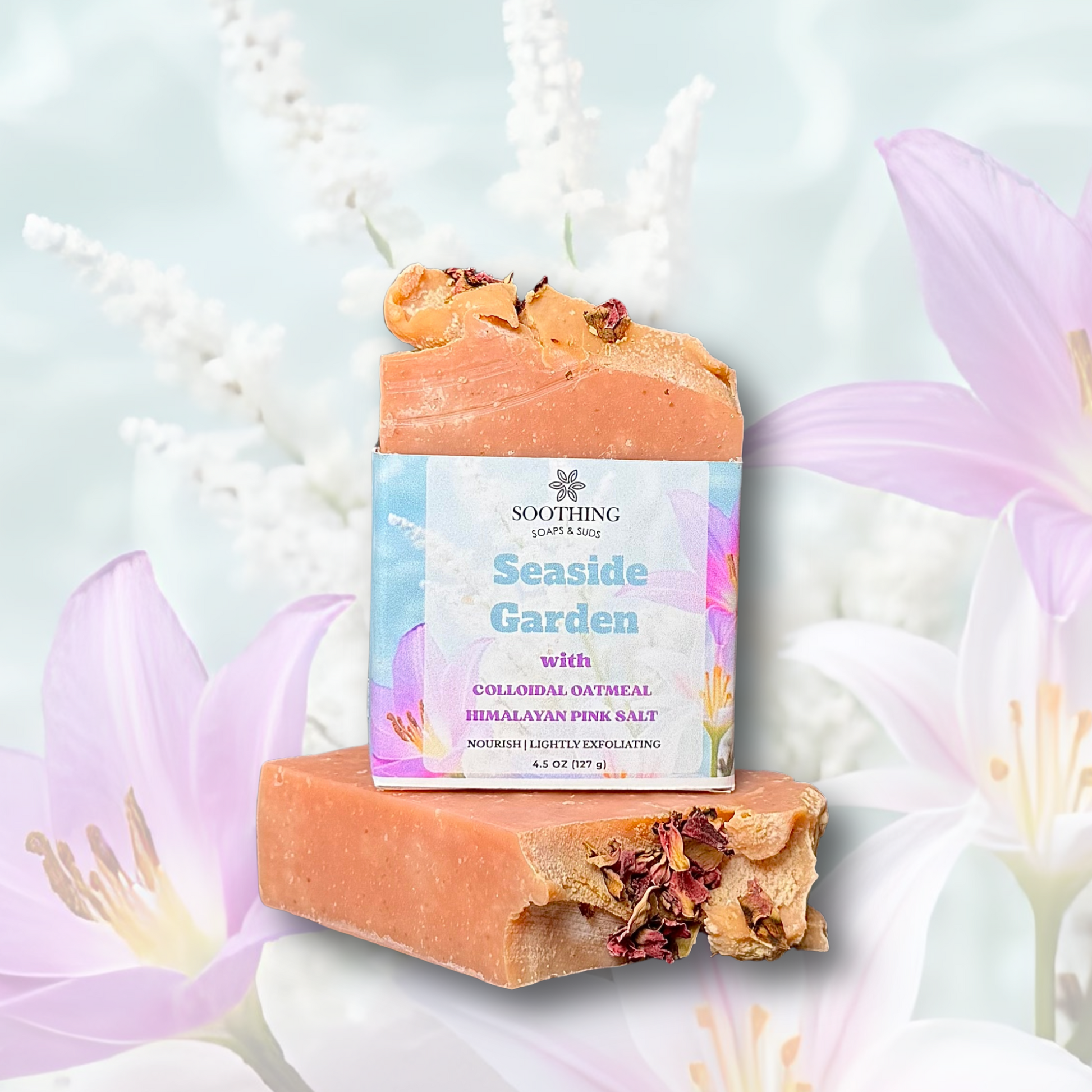 Made with Saponified Oils of (Olive, Coconut, Avocado, Castor), Shea Butter, Colloidal Oatmeal, Himalayan Pink Salt, Mica, and Floral Fragrance Blend.