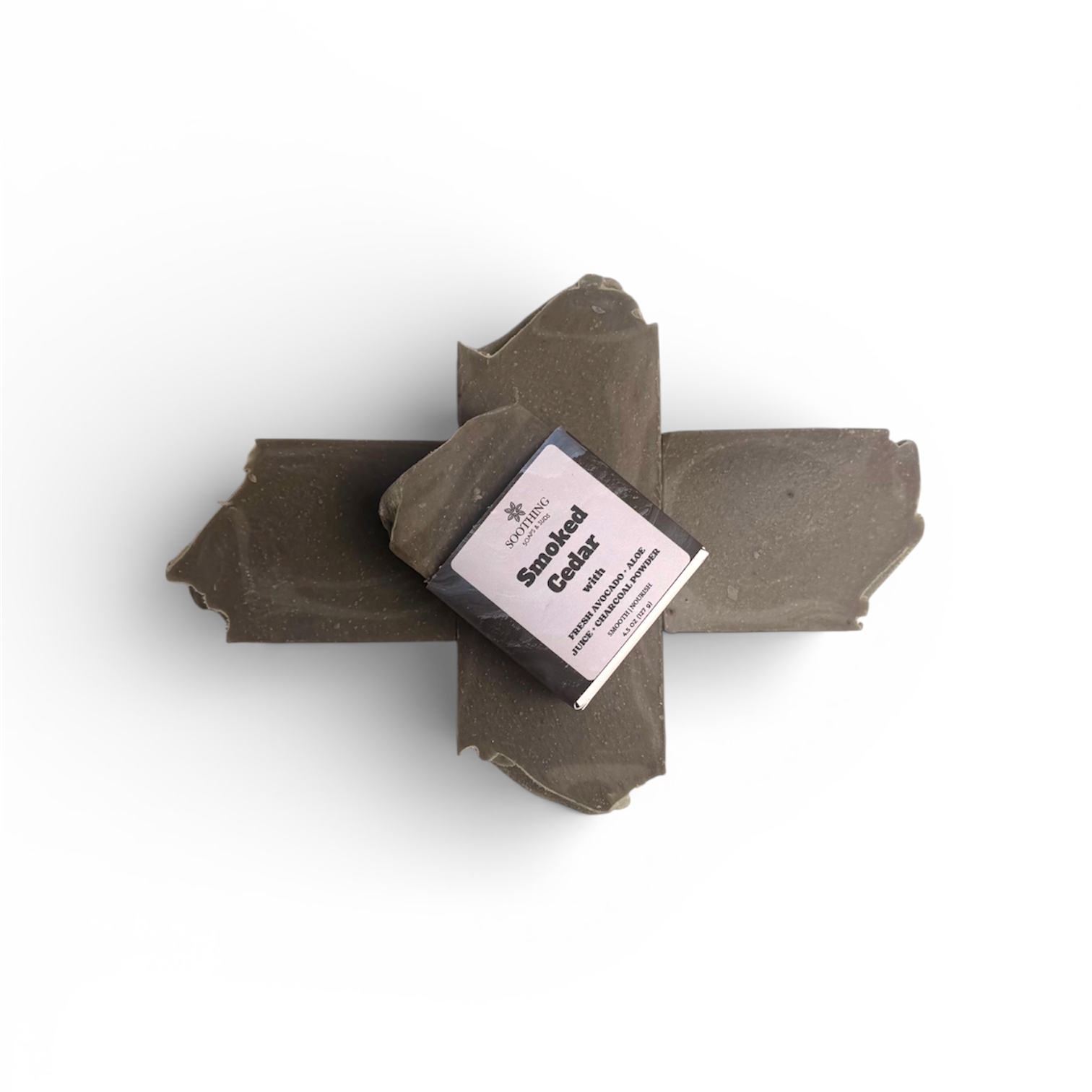 A warm, smoky masculine bar with a deep, grounding aroma inspired by fireside wood and evening air. This rich, creamy soap creates a smooth luxurious lather while nourishing the skin, delivering a bold yet refined bathing experience.