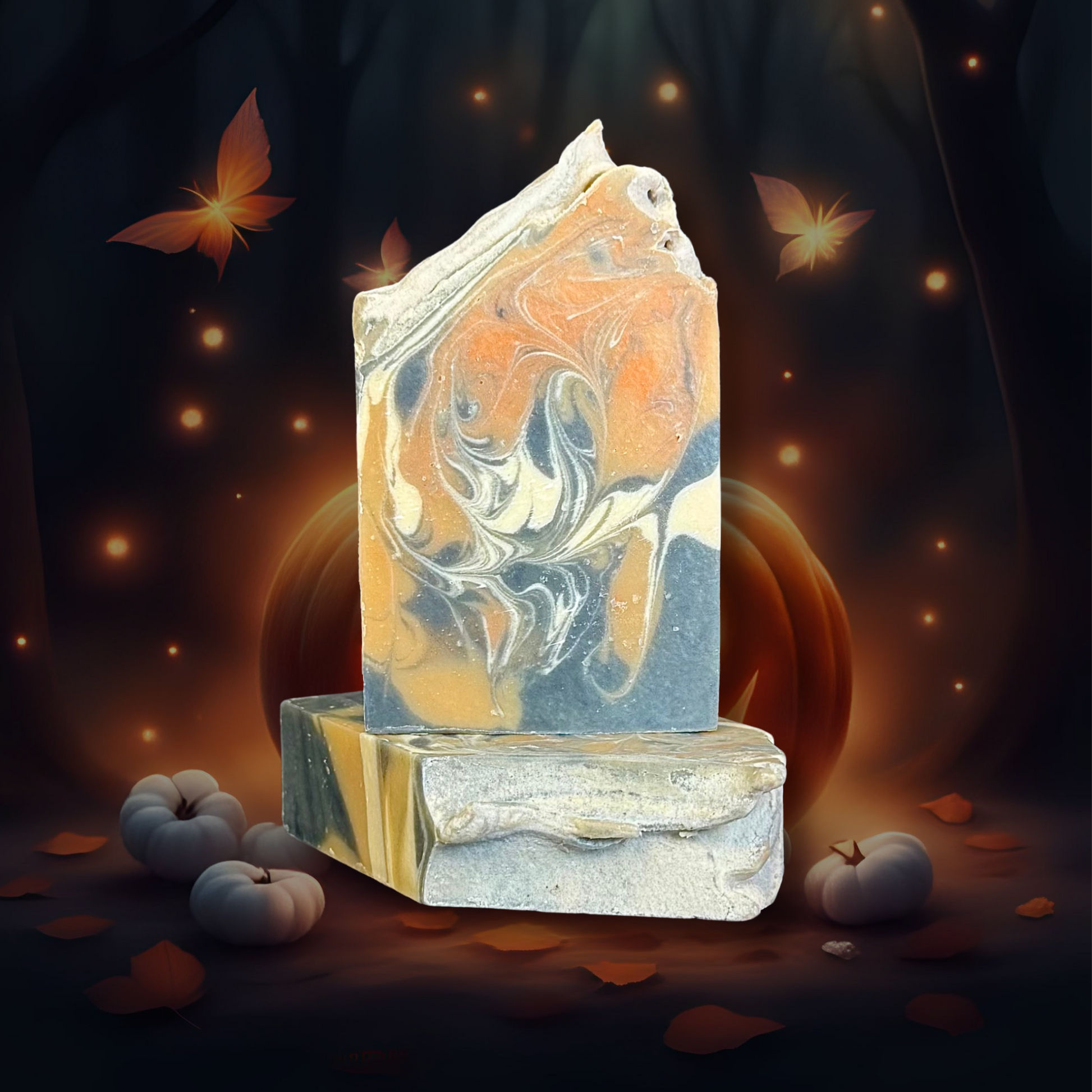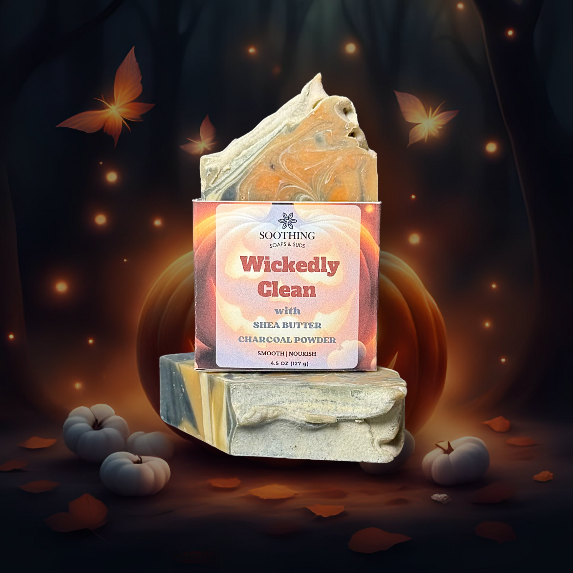 Made with Saponified Oils of (Olive, Coconut, Avocado, Castor), Shea Butter, Mango Butter, Activated Charcoal, Mica, Titanium Dioxide, and Oakmoss & Amber + Eucalyptus Blend.